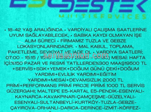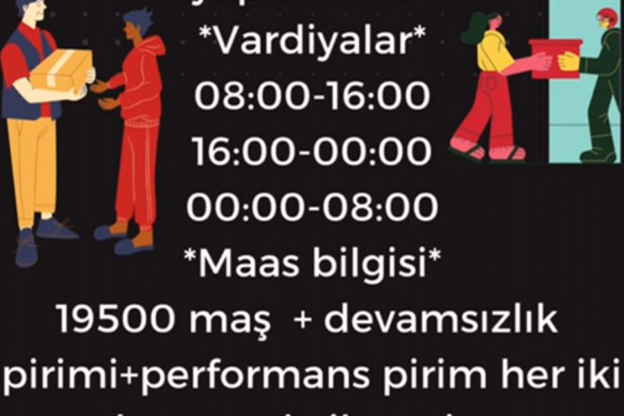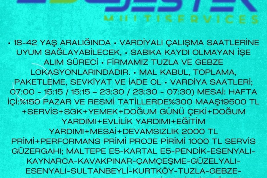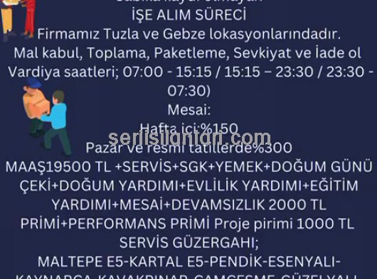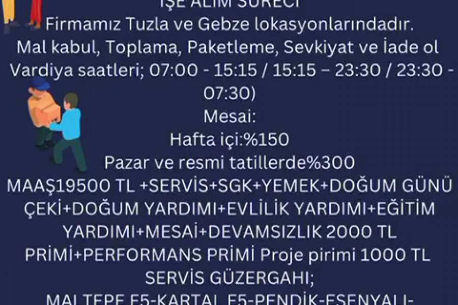 19500MAAŞ+MESAİ+SERVİS+SGK+YEMEK+DEVAMSIZLIK2000 TL VE PERFORMANS 2000 TL PRİMİ (FİYAT DEĞİŞİYOR)