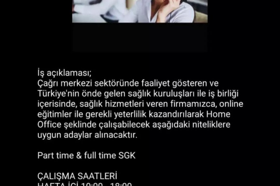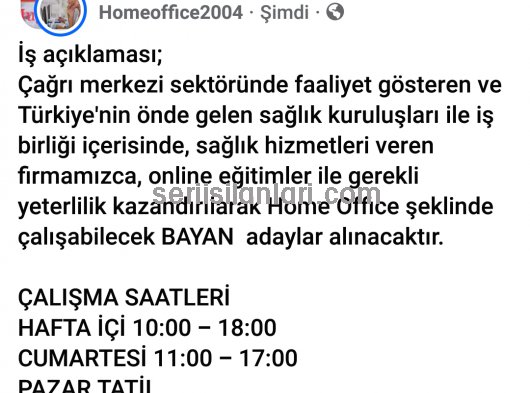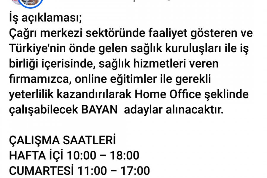 Çağrı merkezi sektöründe faaliyet gösteren ve Türkiye'nin önde gelen sağlık kuruluşları ile iş birliği içerisinde, sağlık hizmetleri veren firmamızca, online eğitimler ile gerekli yeterlilik kazandırılarak Home Office şeklinde çalışabilecek adaylar alınacaktır.